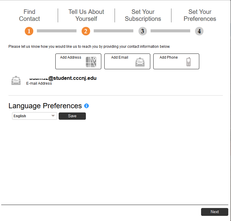 13) Enter your communication preferences and click the Next button at the bottom of the page.